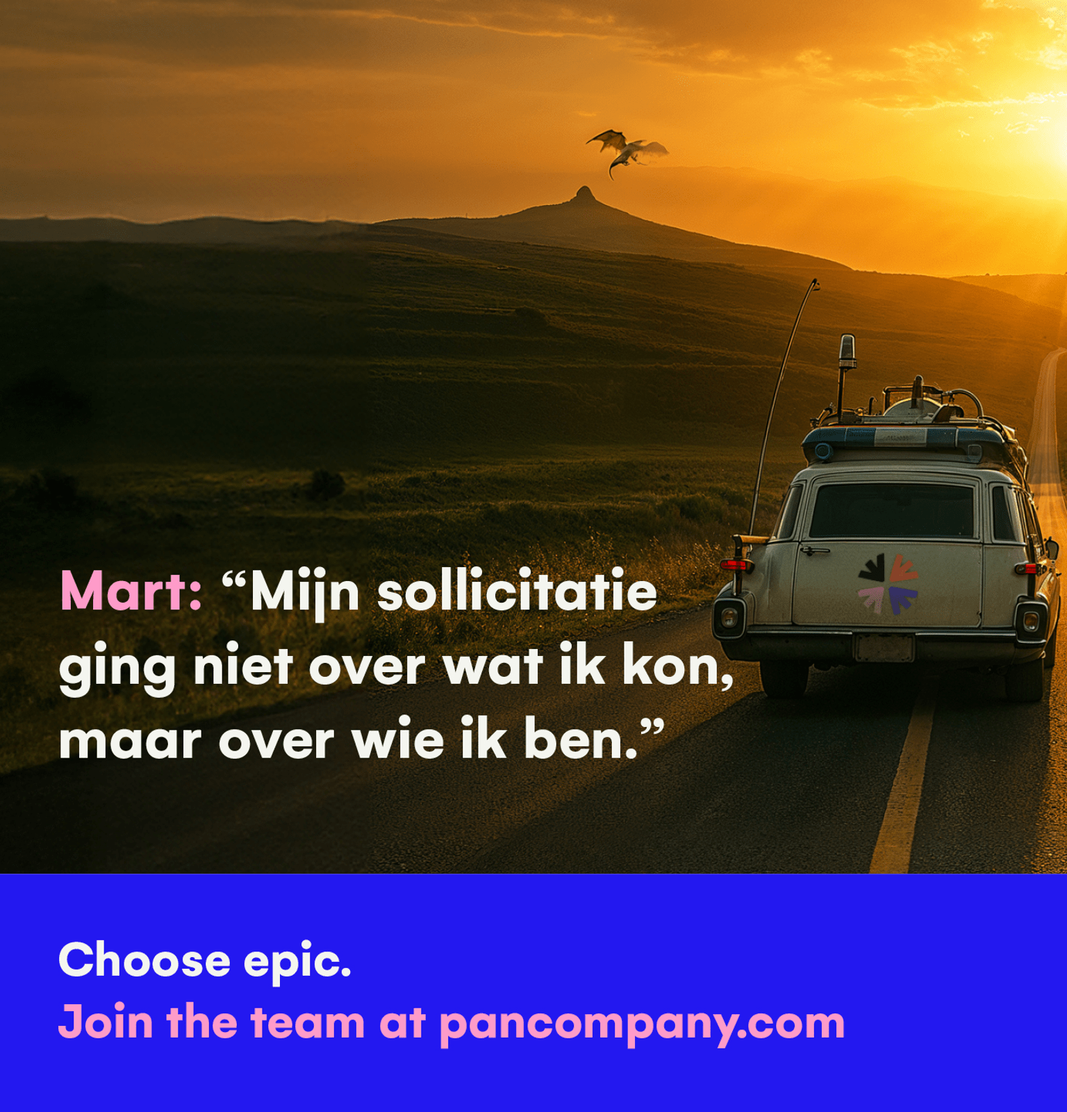 Die verbinding zit niet alleen in gesprekken, maar ook in wat ze samen doen: game-avonden, Weerwolven via WhatsApp, hardloopgroepjes, uitjes en spontane plannen. Waar anderen Pancompany vergelijken met fantasy of superhelden, ziet Mart het anders. “Voor mij voelt het meer als Mario Party,” zegt hij lachend. “Eén grote game, met daarbinnen allemaal kleine games. Je werkt, en daarna speel je weer. En soms loopt dat gewoon door elkaar.”